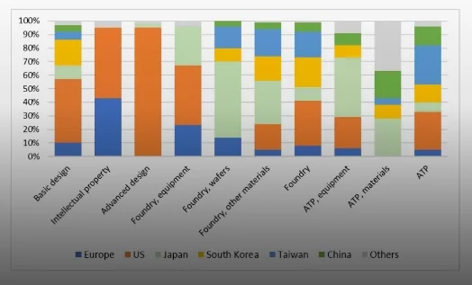 وزن نسبی قابل توجه توزیع جغرافیایی زنجیره ارزش نیمههادی ایالات متحده در مقایسه با اتحادیه اروپا واضح است.