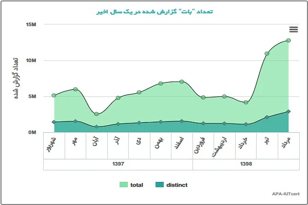 بیشترین گزارش تعداد بات نت ها نیز به مرداد ۹۸ برمیگردد که ۲ میلیون و ۸۸۶ هزار و ۶۵ بات اعلام شده و این در حالی است که در خردادماه، یک میلیون و ۱۱۸ هزار و ۸۱ بات گزارش شده است.