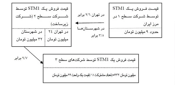 با چنین ساختار چند سطحی هر STM1 (واحد خرید و فروش بین المللی پهنایباند برابر با سرعت 155 مگابیت بر ثانیه) که به قیمت حدود ٩ میلیون تومان وارد کشور میشود پس از عبور از لایههای مختلف یا همان شرکتهای واسط در نهایت به قیمت 232 میلیون تومان به دست مشتری نهایی میرسد.