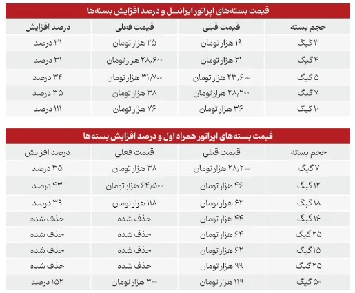 برای مثال اپراتور همراه اول بسته 50 گیگ بلندمدت را که 119 هزار تومان ارائه میداد با افزایش 156 درصدی، قیمت این بسته به 300 هزارتومان تبدیل شده یا اپراتور ایرانسل پیش از افزایش تعرفهها، بسته 10 گیگی را 36 هزار تومان برای مصرفکننده ارائه میداد و یکباره با افزایش 111 درصدی، قیمت این بسته به 76 هزار تومان رسیده است.
