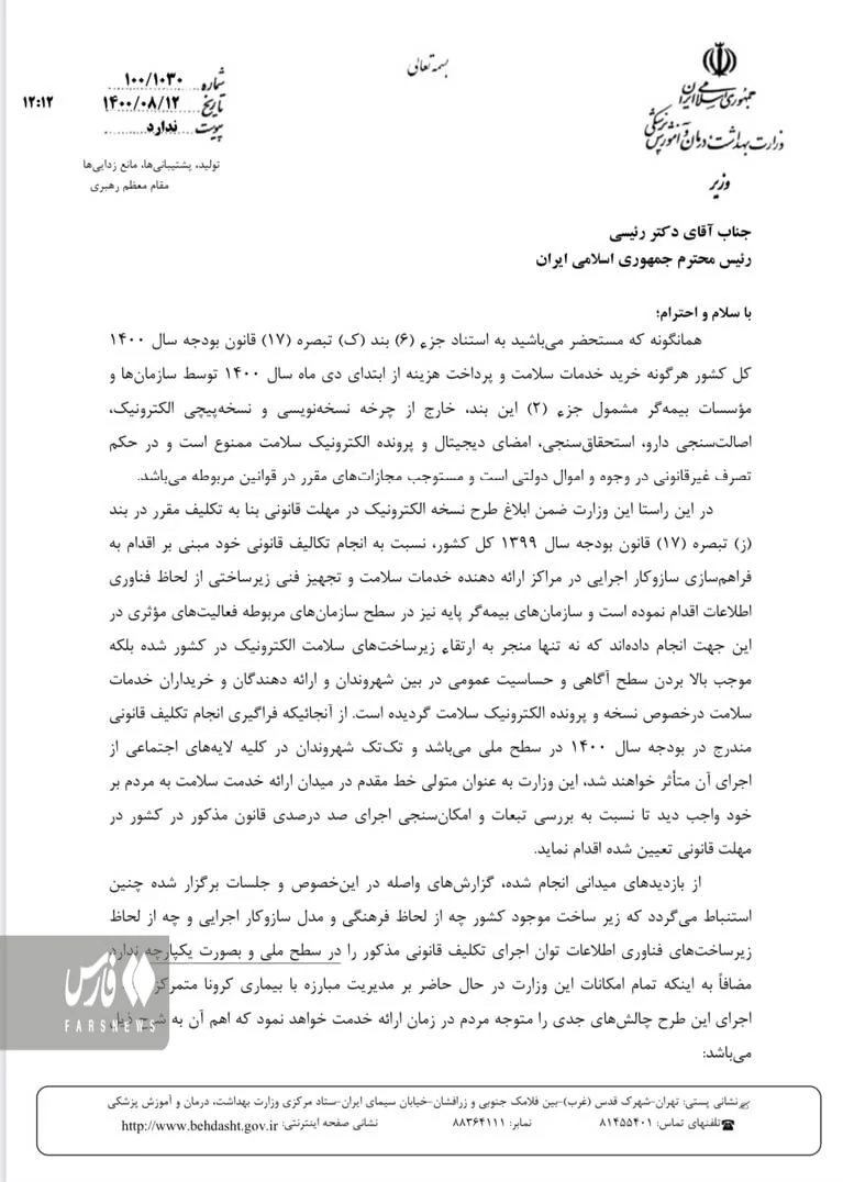 به گزارش خبرگزاری فارس هفته گذشته بهرام عیناللهی وزیر بهداشت با ارسال نامهای به رئیس جمهور به موانع نسخه نویسی الکترونیک اشاره کرده و به جهت تأمین زیرساختهای لازم برای اجرای تکالیف قانونی وزارت بهداشت، درخواست خود را برای تمدید مهلت ۶ ماهه برای اجرای تبصره ۱۷ قانون بودجه سال ۱۴۰۰ ارسال کرده است.