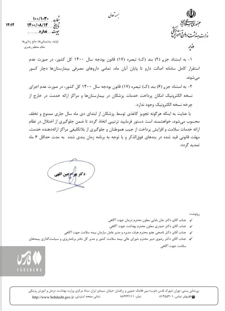 نکته قابل توجه این است که وزیر بهداشت در نامه اخیر خود به رئیس جمهور گفته است که انجام تکالیف قانونی بند ک تبصره 17 قانون بودجه سال 1400 باعث اخلال در نظام ارائه خدمات سلامت و افزایش فشار مالی به مردم خواهد شد! این در حالی است که تأخیر غیرقابل قبول این وزارتخانه در اجرای طرح نسخه الکترونیک و تکمیل سامانه تیتک در سالهای گذشته نه تنها باعث افزایش قاچاق دارو و عرضه خارج از شبکه دارو در بازار سیاه شده است؛ بلکه نقش اساسیای در ایجاد نابسامانی در ارائه خدمات بهداشتی به هموطنان داشته است.
