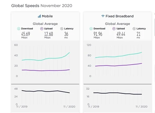 به گزارش خبرگزاری مهر به نقل از اسپید تست، طبق جدیدترین گزارش وب سایت اسپیدتست در ماه نوامبر متوسط سرعت دانلود اینترنت تلفن همراه در سراسر جهان ۴۵.۶۹ مگابیت بر ثانیه و سرعت آپلود آن ۱۲.۶۰ مگابیت برثانیه بوده است. همچنین این گزارش نشان میدهد متوسط جهانی سرعت دانلود اینترنت ثابت در جهان ۹۱.۹۶ مگابیت برثانیه و سرعت آپلود آن ۴۹.۴۴ مگابیت بر ثانیه است.