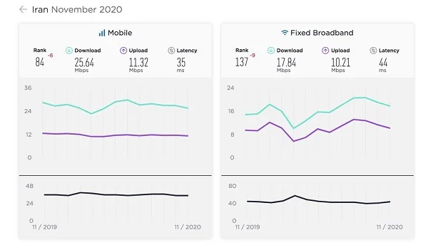 با توجه به اطلاعات ثبت شده در این رده بندی سرعت اینترنت تلفن همراه ایران در نوامبر ۲۰۲۰ میلادی ۲۵.۶۴ مگابیت برثانیه و سرعت آپلود آن ۱۱.۳۲ مگابیت برثانیه بوده است. جایگاه ایران در این رده بندی نسبت به ماه قبل (اکتبر) ۶ پله سقوط کرده و در رده ۸۴ قرار دارد.