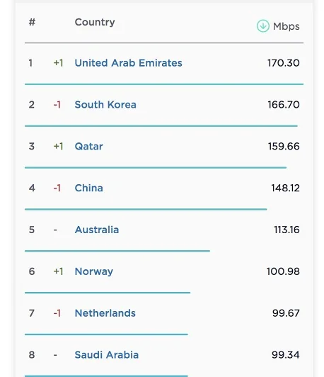 طبق این گزارش در ماه نوامبر امارات متحده عربی با ارائه اینترنت تلفن همراه با سرعت دانلود ۱۷۰.۳۰ مگابیت برثانیه، در جایگاه نخست قرار گرفت. این در حالی است که در دو ماه گذشته (اکتبر و سپتامبر) کره جنوبی این جایگاه را به خود اختصاص داده بود.