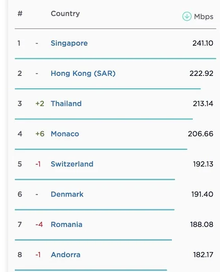 در رده سوم تایلند قرار دارد که اینترنت ثابتی با سرعت دانلود ۲۱۳.۱۴ مگابیت برثانیه برای کاربرانش فراهم کرده است. جایگاه این کشور نسبت به ماه قبل دوپله سعود کرده است. در رده چهارم نیز موناکو با سرعت ۲۰۶.۶۶ مگابیت برثانیه است که جایگاه این کشور نیز، نسبت به ماه گذشته ۶ پله رشد کرده است.