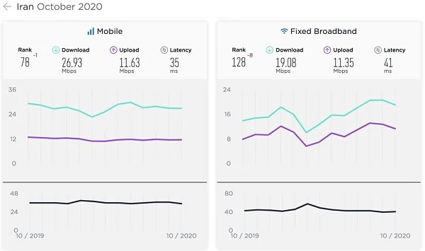 طبق اطلاعات موجود در این وب سایت سرعت دانلود اینترنت موبایل ایران در ماه اکتبر ۲۶.۹۳ و سرعت آپلود آن ۱۱.۶۳ مگابیت برثانیه بوده است. با این حساب ایران در رتبه ۷۸ فهرست قرار میگیرد. این در حالی است که در ماه گذشته میلادی سرعت اینترنت موبایل ایران ۲۷.۰۲ مگابیت برثانیه و رتبه ۷۷ فهرست مذکور را به خود اختصاص داده بود.