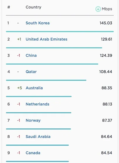 طبق اطلاعات وب سایت اسپیدتست، در صدر فهرست سرعت اینترنت موبایل کره جنوبی با سرعت دانلود ۱۴۵.۰۳ مگابیت برثانیه قرار دارد. این کشور در ماه قبل نیز بالاترین سرعت اینترنت موبایل (۱۲۱ مگابیت برثانیه) را در اختیار کاربرانش قرار داده بود. در رده دوم کشور امارات متحده عربی با سرعت ۱۲۹.۶۱ مگابیت برثانیه قرار دارد که جایگاه آن نسبت به ماه قبل یک پله رشد کرده است. اما چین که در ماه سپتامبر اینترنت موبایلی با سرعت ۱۱۳.۳۵ مگابیت برثانیه ارائه کرده بود در ماه اکتبر با کاهش سرعت روبرو شده و با یک پله سقوط در رده سوم قرار گرفته است. سرعت اینترنت موبایل این کشور ۱۲۴.۳۹ مگابیت برثانیه ثبت شده است.