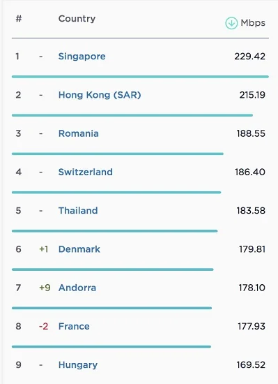 مانند ماههای گذشته سنگاپور همچنان بالاترین سرعت اینترنت موبایل جهان را در اختیار کاربرانش قرار داده است. سرعت اینترنت ثابت این کشور در ماه اکتبر ۲۲۹.۴۲ مگابیت بر ثانیه گزارش شده است. این شاخص اینترنت سنگاپور ماه گذشته ۲۲۶.۶۰ مگابیت برثانیه ثبت شده است.