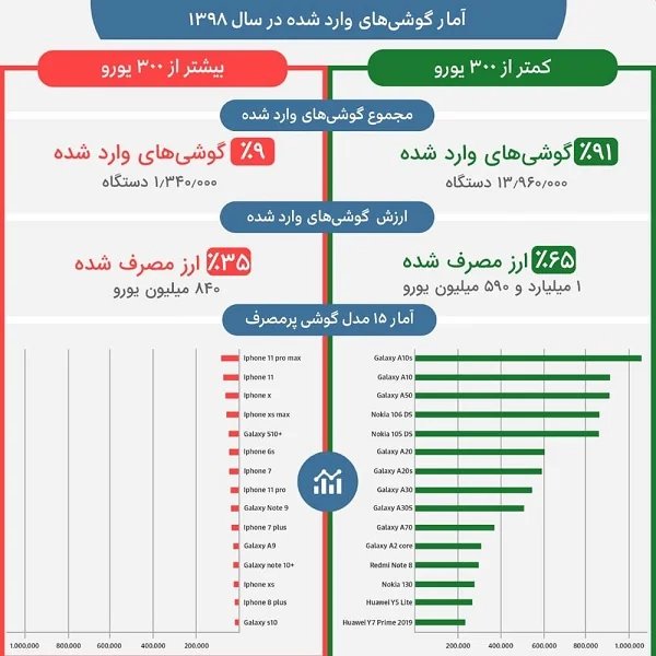 گوشیهای تلفن همراه لاکچری بالای ۳۰۰ یورو با سهم ۳۵ درصد از کل ارز تخصیص داده شده به واردات گوشی تلفن همراه، از نظر تعداد فقط ۹ درصد کل گوشیهای بازار داخل را به خود اختصاص میدهد.
