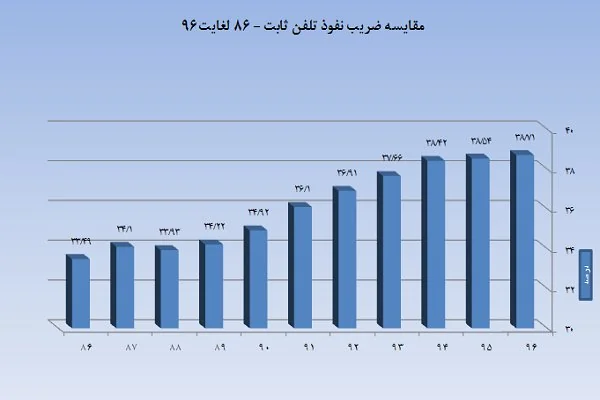 بررسی ها نشان می دهد که ضریب نفوذ تلفن ثابت در کشور طی ۱۰ سال گذشته از ۳۳.۴۹ درصد به ۳۸.۷۱ درصد رسیده است.