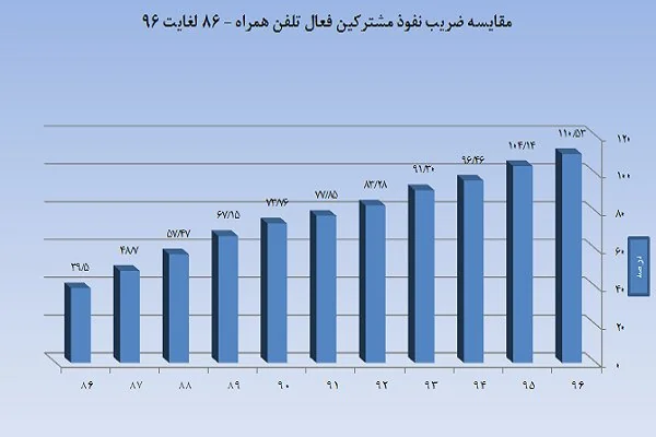 مقایسه ضریب نفوذ مشترکان فعال تلفن همراه نیز حاکی از آن است که در سال ۸۶ ضریب نفوذ موبایل در ایران ۳۹.۵ درصد بود و طی ۱۰ سال اخیر به ۱۱۰/۵۳ درصد رسیده است.