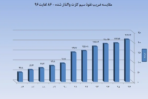 برآوردها نشان می دهد که ضریب نفوذ سیم کارت واگذار شده در کشور نیز از سال ۸۶ که ۴۶.۸ درصد بوده به ۲۱۲.۱۲ درصد رسیده و رشد بیش از ۵ برابری را نشان می دهد.