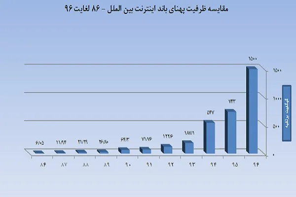 مقایسه ظرفیت پهنای باند اینترنت بین الملل نیز طی ۱۰ سال گذشته نشان می دهد که در سال ۸۶ ظرفیت پهنای باند بین الملل ۶.۰۵ گیگابیت برثانیه بوده که هم اکنون با رشد قابل توجهی به ۱۵۰۰ گیگابیت برثانیه رسیده است..
