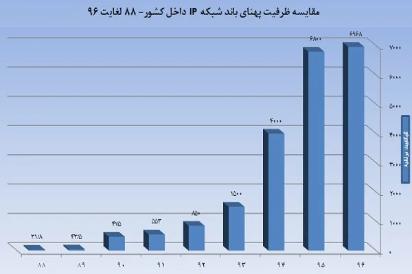 ظرفیت پهنای باند شبکه IP داخلی کشور نیز طی ۱۰ سال اخیر از ۳۱.۸ گیگابیت در سال ۸۶ به ۶۹۶۸ گیگابیت برثانیه در پایان سال ۹۶ رسیده است.