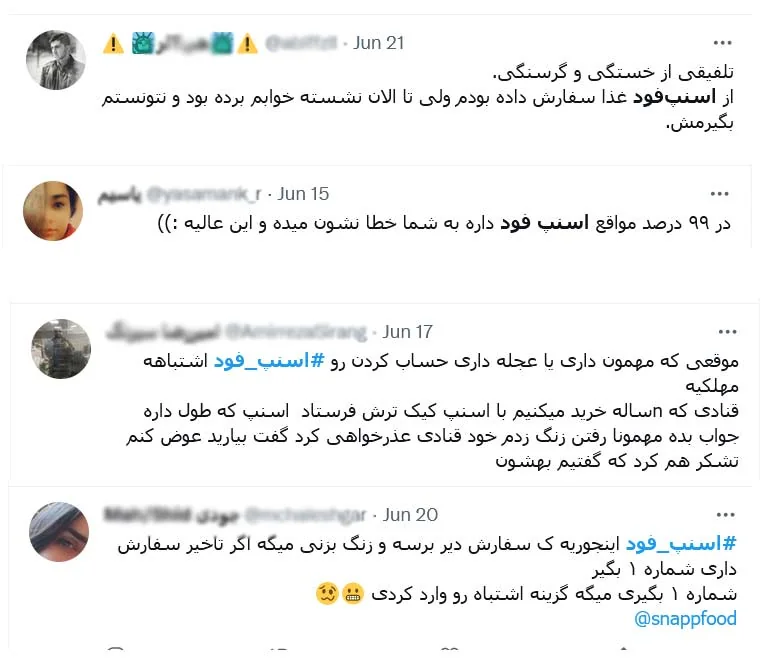 در ادامه به بخشی از توئیت های کاربران عصبانی اسنپ فود در توئیتر توجه فرمائید؛