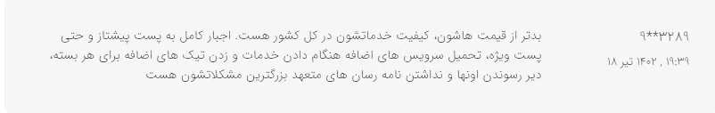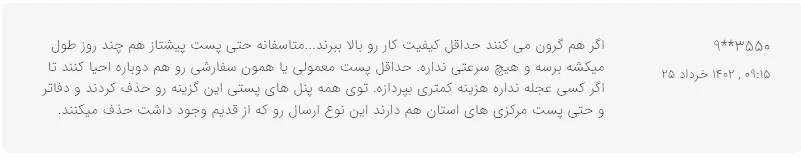 کاربری دیگری هم با اشاره به همین موضوع میگوید: بدتر از قیمت هاشون، کیفیت خدماتشون در کل کشور هست. اجبار کامل به پست پیشتاز و حتی پست ویژه، تحمیل سرویس های اضافه هنگام دادن خدمات و زدن تیک های اضافه برای هر بسته، دیر رسوندن اونها و نداشتن نامه رسان های متعهد بزرگترین مشکلاتشون هست.
