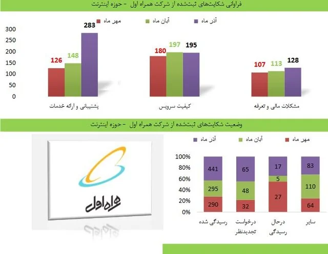 شکایات ثبتشده از شرکت همراه اول در آذرماه در بخش پشتیبانی و ارائه خدمات در مقایسه با شهریورماه، ۷۱ درصد افزایش، در بخش کیفیت سرویس ۱۸ درصد افزایش و در بخش مشکلات مالی و تعرفه ۲۳ درصد افزایش داشته است.