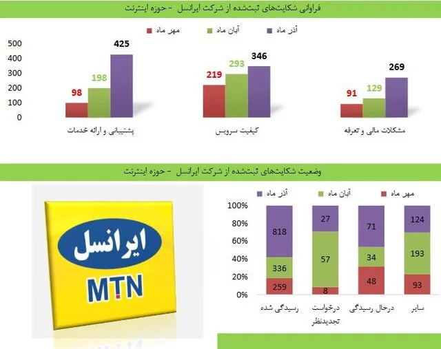 مهمترین نتایج حاصل از تحلیل دادههای استخراجشده از ایرانسل حاکی از آن است که در آذرماه در حوزه اینترنت ۴۵۲ شکایت ثبتشده که ۴۶.۷ درصد شکایات مربوط به پشتیبانی و ارائه خدمات بوده است و در آذرماه نسبت به آبانماه و مهرماه افزایش داشته است. تعداد شکایات رسیدگیشده در آذرماه نسبت به آبانماه ۱.۴ برابر افزایش داشته، درحالیکه تعداد شکایات ثبتی در همین بازه ۶۷.۷ درصد افزایش داشته است. با توجه به این آمار میتوان نتیجه گرفت عملکرد این اپراتور در رسیدگی به شکایات در آذرماه نسبت به آبانماه افزایش ۷۲.۳ درصدی داشته است.