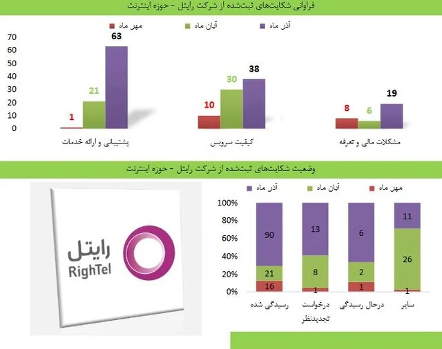 شکایات ثبتشده از شرکت رایتل در آذرماه در بخش پشتیبانی و ارائه خدمات در مقایسه با شهریورماه، ۱۱۶۰ درصد افزایش، در بخش کیفیت سرویس ۱۳۷ درصد افزایش و در بخش مشکلات مالی و تعرفه ۱۱۱ درصد افزایش داشته است.