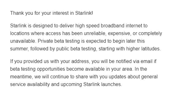 پس از ارسال درخواست، کاربر ایمیلی از طرف اسپیسایکس دریافت میکند که در آن به تلاش این شرکت برای ایجاد دسترسی به خدمات اینترنت پرسرعت در سراسر جهان اشاره شده است؛ تلاشی که بهخصوص برای بهرهمندی مردم در مناطقی صورت میگیرد که دسترسی آنها به اینترنت با مشکل مواجه است و یا استفاده از آن گران تمام میشود. در این پیام خطاب به کاربر آمده که در صورت قرار گرفتن ناحیه سکونت وی در مناطق تحت پوشش نسخه آزمایشی این خدمات، اطلاعرسانی در این مورد انجام خواهد شد. همچنین کاربر در مورد پیشرفتهای پروژه استارلینک در آینده اخباری را دریافت میکند. گفتنی است اسپیسایکس قصد دارد اواخر تابستان جاری ارائه اینترنت را بهصورت آزمایشی به برخی از کاربران منتخب آغاز کند.