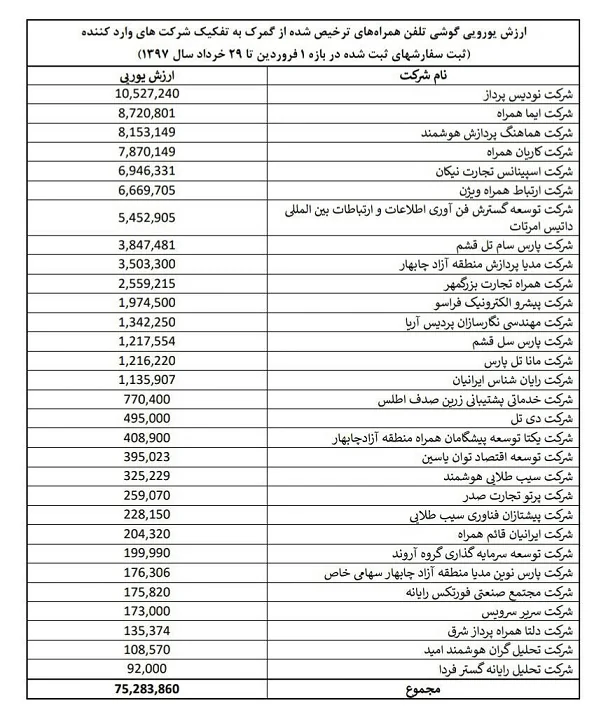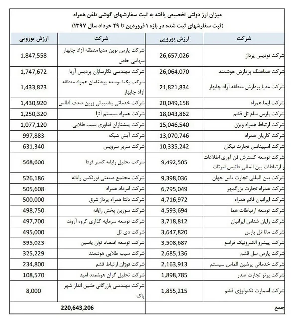 مرکز روابط عمومی و اطلاع رسانی وزارت ارتباطات و فناوری اطلاعات با اعلام فهرستی از 40  شرکت واردکننده گوشی همراه چنین توضیح داد: از ابتدای سال 97 تا 29 خردادماه به 40 شرکت وارد کننده گوشی تلفن همراه، ارز دولتی تخصیص داده شده است که 30 شرکت از این فهرست با بخشی از ارز تخصیص داده شده اقدام به واردات گوشی تلفن همراه کرده اند.