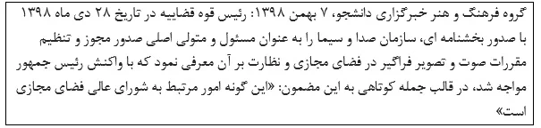 گروه فرهنگ و هنر خبرگزاری دانشجو، 7 بهمن 1398: رئیس قوه قضاییه در تاریخ ۲۸ دی ماه 1398 با صدور بخشنامه ای، سازمان صدا و سیما را به عنوان مسئول و متولی اصلی صدور مجوز و تنظیم مقررات صوت و تصویر فراگیر در فضای مجازی و نظارت بر آن معرفی نمود که با واکنش رئیس جمهور مواجه شد، در قالب جمله کوتاهی به این مضمون: «این گونه امور مرتبط به شورای عالی فضای مجازی است»