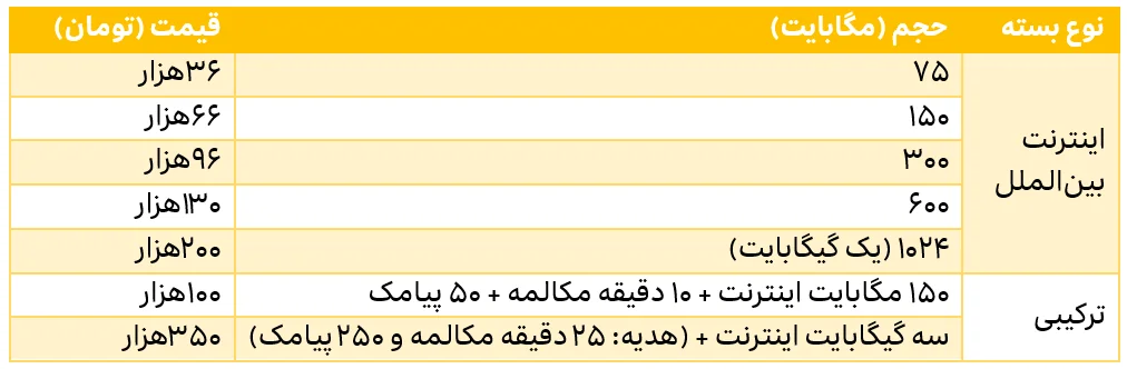 بستههای اینترنت رومینگ ارائه شده توسط ایرانسل، شامل بسته ۷۵ مگابایتی با قیمت ۳۶هزار تومان، بسته ۱۵۰ مگابایتی با قیمت ۶۶هزار تومان، بسته ۳۰۰ مگابایتی با قیمت ۹۶هزار تومان، بسته ۶۰۰ مگابایتی با قیمت ۱۳۰هزار تومان و بسته یک گیگابایتی با قیمت ۲۰۰هزار تومان هستند.بستههای ترکیبی ارائهشده توسط ایرانسل نیز، شامل بسته ترکیبی ۱۵۰ مگابایت اینترنت رومینگ، ۱۰ دقیقه مکالمه و ۵۰ پیامک با قیمت ۱۰۰هزار تومان و بسته ترکیبی سه گیگابایت اینترنت با قیمت ۳۵۰هزار تومان به همراه ۲۵ دقیقه مکالمه هدیه و ۲۵۰ پیامک هدیه هستند.