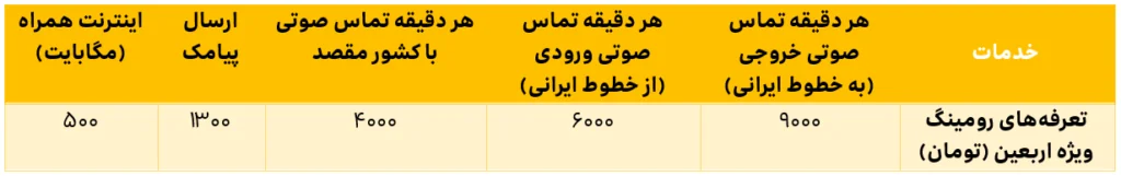 بر این اساس، هر دقیقه تماس صوتی با ایران، ۹۰۰۰ تومان، هر دقیقه تماس صوتی دریافتی از ایران، ۶۰۰۰ تومان، هر دقیقه تماس صوتی با کشور عراق، ۴۰۰۰ تومان، ارسال هر پیامک، ۱۳۰۰ تومان و هر مگابایت اینترنت همراه، ۵۰۰ تومان خواهد بود.