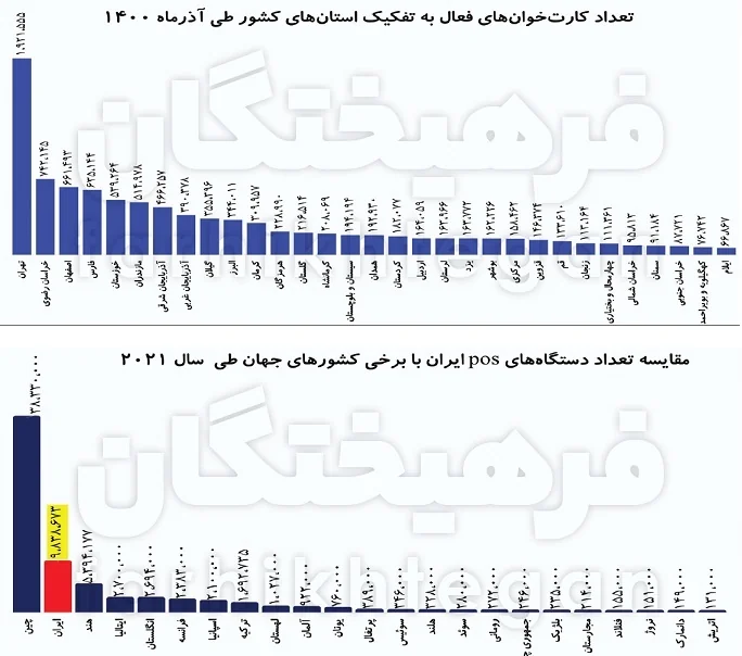 بررسی آمارهای تعداد POSهای ایران در مقایسه با برخی کشورهای منتخب جهان نتایج قابلتاملی را نشان میدهد. براساس آمارها، ایران با داشتن بیش از 9.8 میلیون دستگاه کارتخوان، پس از چین دوم بوده و آمریکا با 6 میلیون دستگاه در رتبه سوم قرار دارد. طبق آمارهای رسمی بانک مرکزی چین، از سال 2013 تا 2018 تعداد پایانههای POS در چین بهطور میانگین هرساله بیش از 2 میلیون و 800 هزار دستگاه افزایش یافته و از حدود 10 میلیون و 63 هزار در سال 2013 به 34 میلیون و 148 هزار دستگاه تا سال 2018، به 30 میلیون و 892 هزار دستگاه تا پایان سال 2019، 33 میلیون و 312 هزار دستگاه تا پایان سال 2020 و به 38 میلیون و 330 هزار دستگاه تا پایان سال 2021 رسیده است. درحالحاضر طبق آمارهای ارائهشده، تعداد دستگاههای POS به ازای هر 10 هزار چینی بزرگسال (بالای 18 سال) 355 دستگاه است (تعداد جمعیت بالای 18 سال چین یک میلیارد و 79 هزار نفر است) که در مقایسه با حدود 1591 دستگاه در ایران (جمعیت بالای 17 سال ایران 61 میلیون و 822 هزار نفر است)، ایرانیها 4.5 برابر بیشتر از چینیها دستگاه POS دارند.