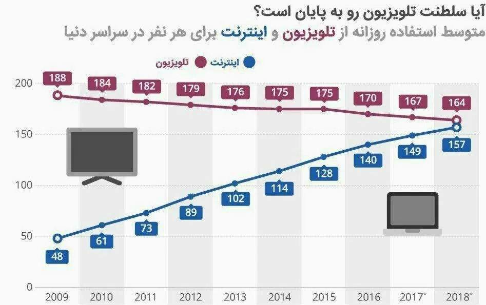 بر اساس اطلاعاتی که اخیرا توسط Zenith منتشر شده  است، شکاف مصرف روزانه بین تلویزیون واینترنت که درسال گذشته ۳۰ دقیقه بود،تا سال ۲۰۱۸ به ۷دقیقه کاهش می یابد. به گزارش تسنیم متوسط استفاده روزانه از تلویزیون و اینترنت برای هر نفر در سراسر دنیا را در نمودار زیر ببینید: انتهای پیام/