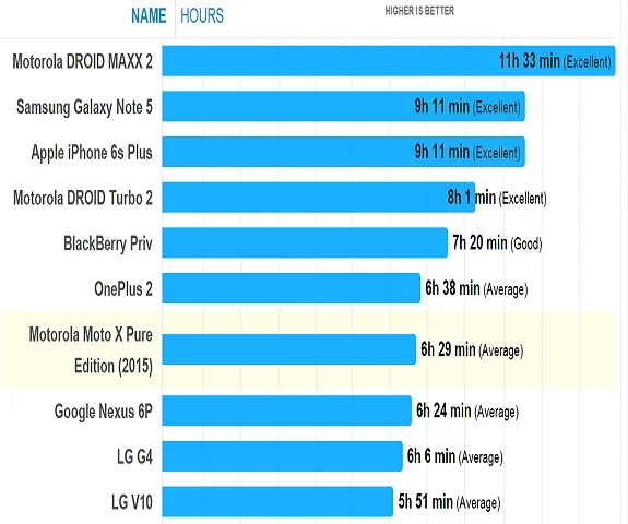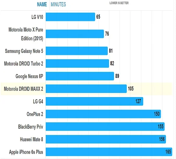 LG 10 در این تست ناامید کننده ظاهر شد و با مدت زمان 5 ساعت و 51 دقیقه کار خود را به پایان رساند. این مقدار به شکل قابل توجهی از رقبایی همچون Galaxy Note 5 ، Iphone 6s و Droid Maxx موتورلا کمتر بوده است.