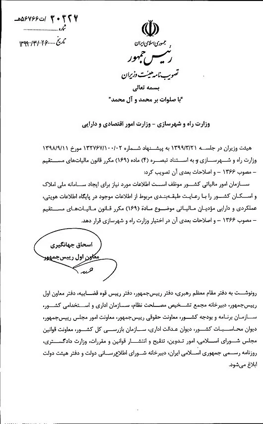 معاون اول رئیس جمهور واگذاری سامانه املاک و اسکان به سازمان امور مالیاتی را به وزرای راه و شهرسازی و اقتصاد ابلاغ کرد.