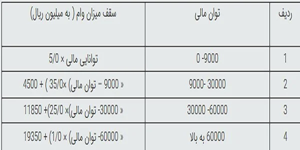 سقف تسهیلات قابل پرداخت بر اساس توان مالی شرکت ها مطابق جدول زیر است: