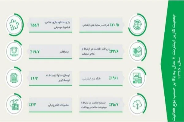 در این آمار، ۳۵.۷ درصد کاربران ایرانی برای دریافت اطلاعات در ارتباط با موضوعات سلامت و بهداشت در اینترنت جستجو می کنند. ۱۹.۱ درصد کاربران در خصوص بانکداری الکترونیکی در اینترنت فعال هستند و ۳۳.۶ درصد از فعالیت کاربران در اینترنت به دریافت اطلاعات در ارتباط با کالا و خدمات مربوط می شود.