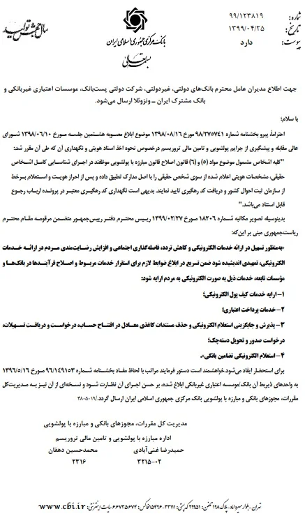 این بخشنامه بر اساس مصوبه هشتمین جلسه شورای عالی مقابله و پیشگیری از جرایم پولشویی و تامین مالی تروریسم در خصوص نحوه اخذ اسناد هویتی و نگهداری آن صادر شد که طی آن مقرر شده بود که کلیه اشخاص مشمول موضوع مواد ۵ و ۶ قانون اصلاح قانون مبارزه با پولشویی موظفند در اجرای شناسایی کامل اشخاص حقیقی، مشخصات هویتی اعلام شده از سوی شخص حقیقی را با اصل مدارک تطبیق داده و پس از احراز هویت و استعلام برخط از سازمان ثبت احوال کشور و دریافت کد رهگیری تایید کنند.