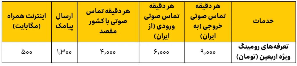بر این اساس، هر دقیقه تماس صوتی با ایران، ۹۰۰۰ تومان، هر دقیقه تماس صوتی دریافتی از ایران، ۶۰۰۰ تومان، هر دقیقه تماس صوتی با کشور عراق، ۴۰۰۰ تومان، ارسال هر پیامک، ۱۳۰۰ تومان و هر مگابایت اینترنت همراه، ۵۰۰ تومان خواهد بود.