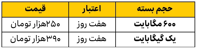 این بستهها، شامل بسته ۶۰۰ مگابایتی و یک گیگابایتی هستند که با اعتبار هفت روز و با قیمت به ترتیب، ۲۵۰هزار تومان و ۳۹۰هزار تومان، ارائه شدهاند.