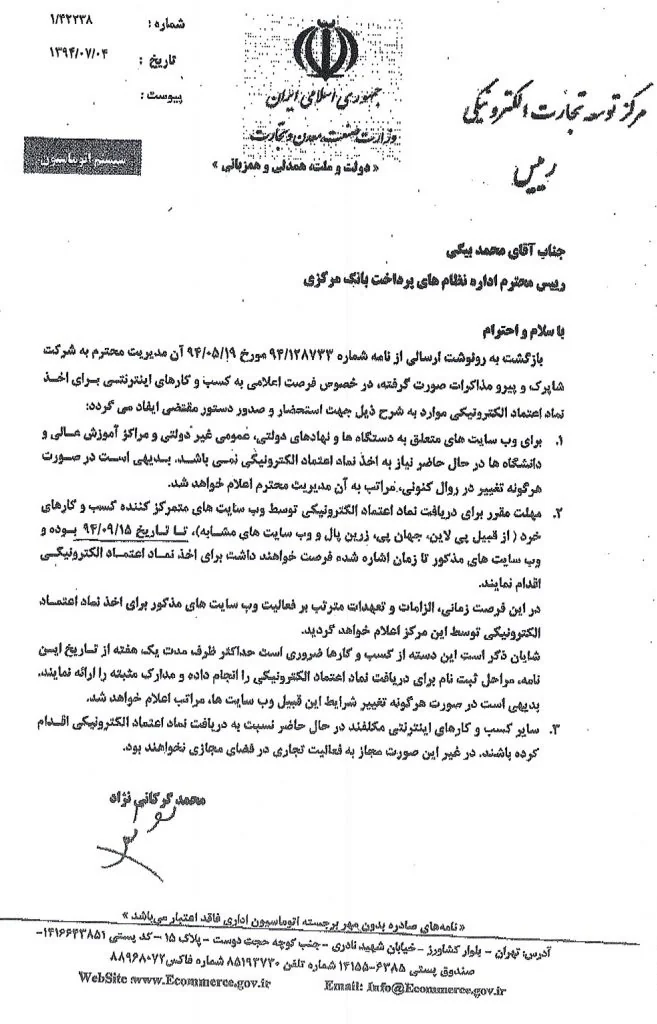 ب- همانطور که قبلاً طی مکاتبات متعدد با متولیان بخشهای مختلف ازجمله شرکت شاپرک اعلام شده است، توقف ارائه خدمت درگاه پرداخت به کسبوکارهای اینترنتی فاقد نماد اعتماد الکترونیکی، «پیشنهاد» مرکز جهت رعایت ضوابط قانونی بوده است. با یادآوری بیش از دو سال مکاتبه در این زمینه تأکید مینماید که مشمولین نامه مرکز صرفاً کسبوکارهای اینترنتی میباشند و تسرّی آن به تأمینکنندگان و عرضهکنندگان خدمات پرداخت اساساً موردنظر مرکز نیست.