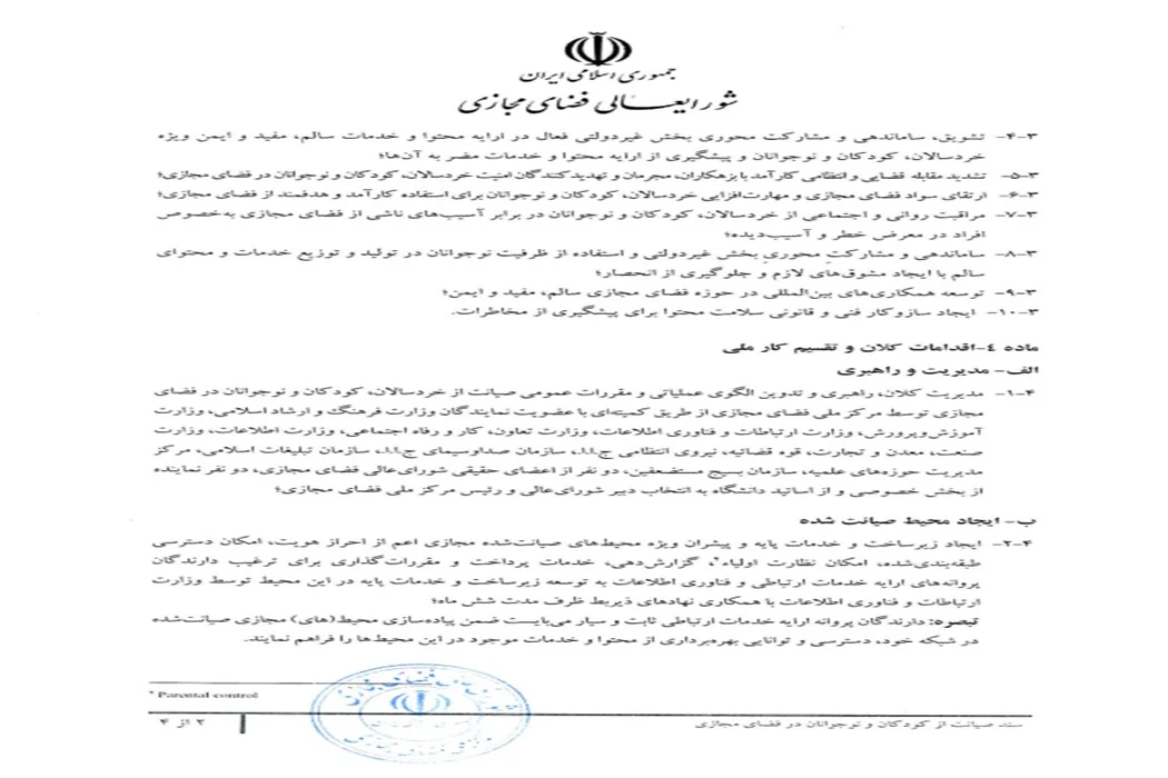 در ایران نیز در سال ۱۴۰۰ شورایعالی فضای مجازی سند صیانت از کودکان و نوجوانان در فضای مجازی را به تصویب رساند. هدف از تصویب این مصوبه فراهم کردن محیطی خاص برای کودکان در فضای مجازی در چارچوب قانون اسلامی ایرانی است.