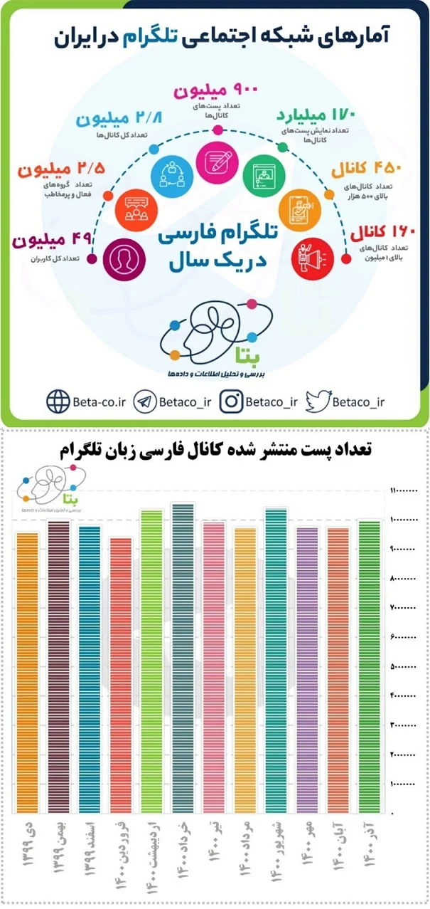 با بررسی فعالیت کانال ها در بازه یک سال گذشته آنچه مشخص هست این است که تعداد کل پستهای منتشر شده کانال های تلگرامی در هر ماه بیش از 100 میلیون بوده است که البته این پست ها بعضی بازنشر شده بوده است که همان گونه که گفته شد در مجموع بیش از 900میلیون پست تلگرامی یکتا در یک سال در تلگرام فارسی منتشر می شود. این تعداد پست به صورت روزانه در حدود 1.1تا 2 میلیارد ویو از کاربران دریافت می کند (این نوسان به دلیل وجود انتخابات 1400 است که با توجه به سیاسی شدن فضا استفاده از کانال های خبری در آن ایام افزایش یافت) این تعداد نمایش در سال 96 قبل از فیلترینگ تلگرام به صورت متوسط در حدود 2تا2.5 میلیارد ویو در روز بوده است.