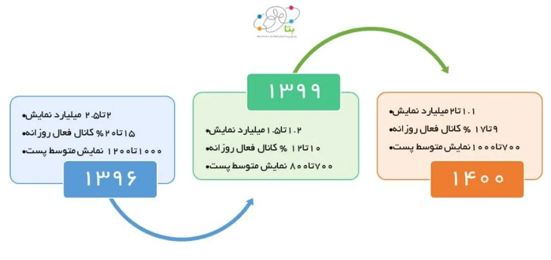 نکته مهم دیگر متوسط نمایش هر پست است که در حال حاضر در حدود 700تا1000 نمایش برای پست در تلگرام فارسی مشخص شده است که این عدد در ماه های غیر فیلترینگ سال 96 در حدود 1200تا1000نمایش برای هر پست بوده است. اگر بازگشتی به سال قبل داشته باشیم و این اعداد را در سال 1399 بررسی کنیم حدود 700تا800 نمایش برای هر پست هست که در سال 1400 به علت انتخابات و پیگیری اخبار انتخابات از طریق تلگرام در بازه ای با افزایش روبرو بوده است.