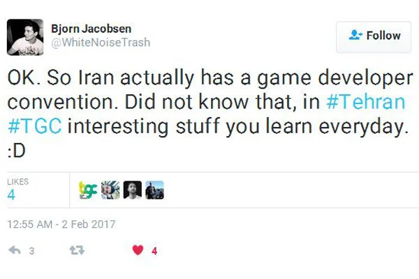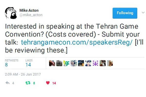 جاناتان بلو هم به‌عنوان یکی از مطرح‌ترین بازی‌سازان مستقل جهان نیز در پاسخ به همین توئیت مایک اکتون، حضور در تهران و نمایشگاه TGC را «وسوسه‌انگیز»   توصیف کرده بود.