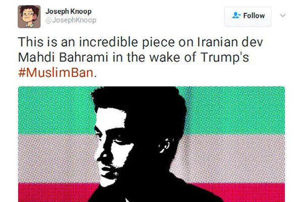 مهدی بهرامی یکی از بهترین بازی‌سازان مستقل ایرانی است که جوایز متعدد بین‌المللی حتی از فستیوال‌های آمریکا دریافت کرده است. جوزف نوپ به‌عنوان یک خبرنگار بازی در توییتر خود اعلام کرده است که اگر مهدی بهرامی در دوران ترامپ از فستیوال‌های آمریکا جایزه می‌گرفت نمی‌توانست برای دریافت جایزه‌اش به این کشور سفر کند. وی در ادامه همین توییت گفته است که نمایشگاه TGC فرصت شگفت‌انگیزی برای ارتباط بازی‌سازان ایرانی با جامعه بازی‌سازی آمریکا بود که حالا این فرصت به مخاطره افتاده است.