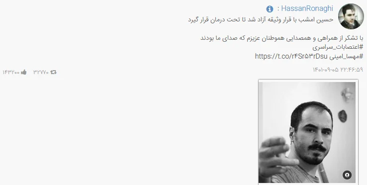 توئیت وریا غفوری در آبان ماه و توئیت حسن رونقی در آذرماه نیز به ترتیب در حمایت از ناآرامیها و انتشار خبر آزادی حسین رونقی منتشر شده بود.