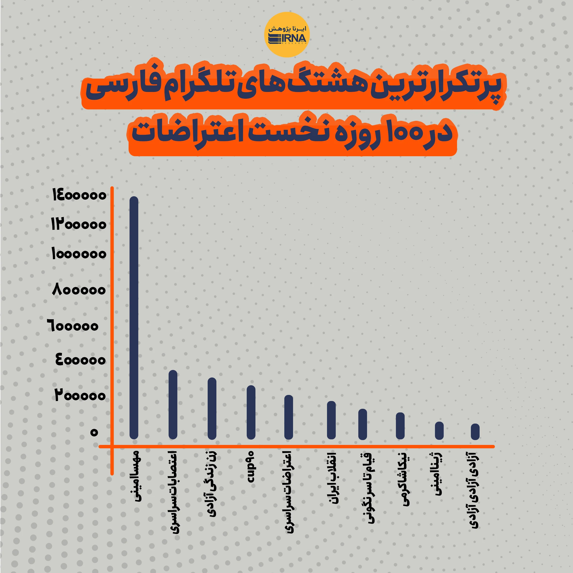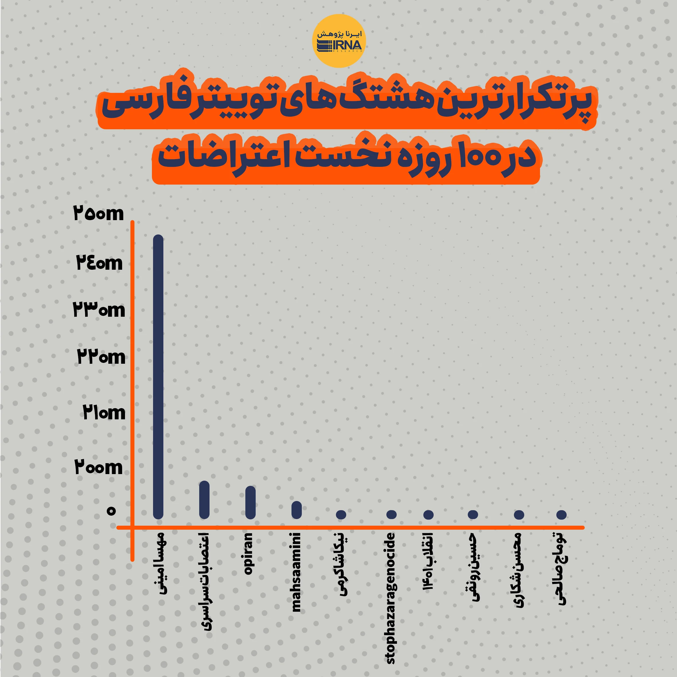 هشتگها با توجه به اهمیتی که در اجماع کاربران و ایجاد کمپینهای مجازی دارند در پلتفرمهای مختلف قابل اهمیت و بررسی هستند. پرتکرارترین هشتگهای توئیتر فارسی در ۱۰۰ روز نخست اعتراضات در نمودار میلهای زیر ارائه شده است: