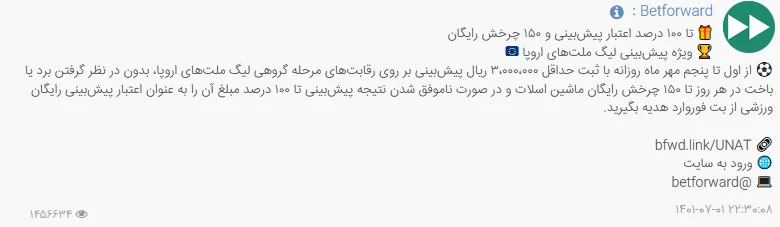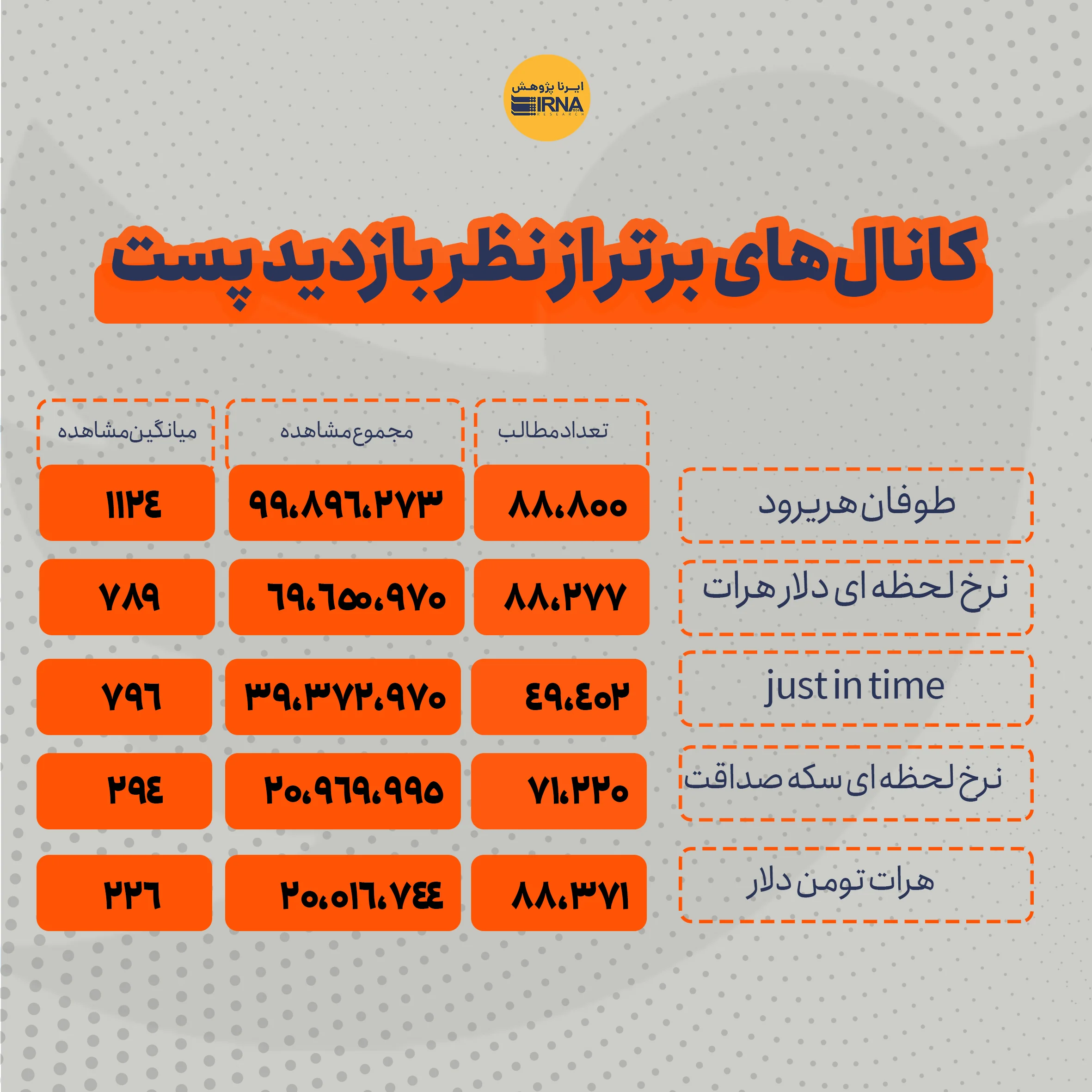 در اینجا نیز سه پست پربازدید در بازه زمانی ۱۰۰ روزه از شهریور تا دی ماه مرتبط با حوزه ورزش و اقتصاد و درباره پیشبینی جام جهانی قطر و تبلیغات دو بانک شهر و تجارت بوده است. این پستها به ترتیب مربوط به کانالهای تلگرامی بست فوروارد، بانک شهر و بانک تجارت با یک میلیون و ۴۰۰، یک میلیون و سیصد و یک میلیون بازدید بوده است.