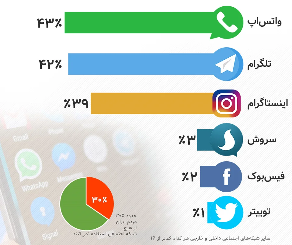 از سوی دیگر برای بررسی میزان نفوذ پلتفرمهای مختلف میتوان به نظرسنجیها و سابقه مطالعات پیشین استفاده کرد. براساس نتایج نظرسنجی ایسپا در سال ۱۴۰۱، ۷۸.۵ درصد مردم ایران دست کم عضو یک شبکه اجتماعی هستند یا از یک پیام رسان استفاده و ۹۶.۹ درصد شرکت کنندگان بین ۱۸ تا ۲۹ ساله بیان داشتهاند حداقل از یک شبکه اجتماعی یا پیام رسان استفاده کنند. ادعا شده واتس اپ با سهم ۷۱.۱ درصدی، محبوبترین پیام رسان در بین شهروندان ایران است. اینستاگرام هم در بین مردم ایران در جایگاه دوم قرار دارد و ۴۹.۴ درصد افراد از آن استفاده میکنند. ادعا شده محبوبیت تلگرام با کاهش ۹ درصدی نسبت به تیرماه ۱۴۰۰ به ۳۱.۶ درصد رسیده است. محبوبیت توییتر هم تنها ۳ درصد عنوان شده است. همین آمار نشان میدهد افراد با تحصیلات بالاتر بیشتر از پیام رسانها یا شبکههای اجتماعی استفاده میکنند و محبوبیت آنها در بین افراد با تحصیلات پایینتر اما با سواد کمتر است.