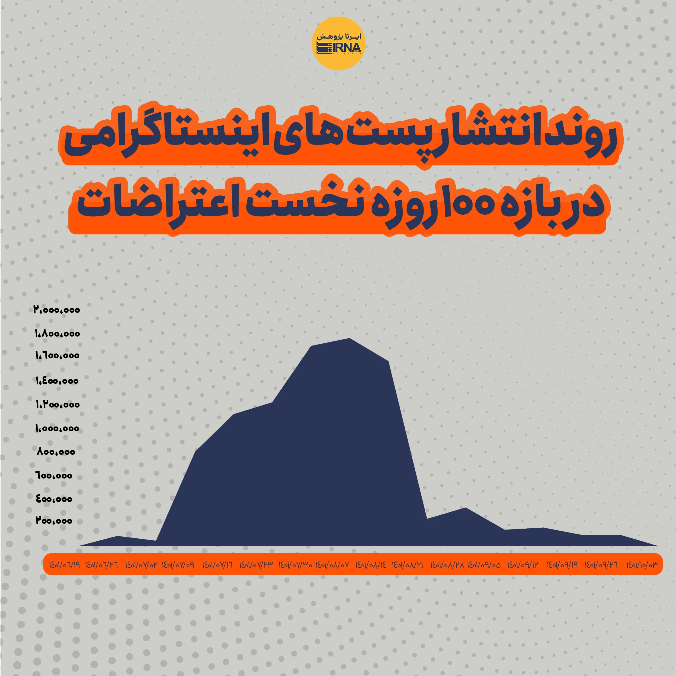 به دلیل محدودیتهای اینستاگرام در رصد اکانتهای خصوصی و مشکلاتی که سامانه پایشگر در استخراج دادههای این پلتفرم داشته، در این بخش تنها دادههای پیجهای خبری فارسی زبان و برخی هشتگهای خاص جمعآوری و از نظر کمی و کیفی مورد تحلیل قرار گرفته است. براین اساس، در بازه زمانی ۱۰۰ روزه نخست اعتراضات یعنی از ۲۵ شهریور تا ۳ دی ماه، ۷ میلیون و ۵۰۰ هزار پست اینستاگرامی استخراج شده که این تعداد پست در مجموع ۱ میلیارد لایک و ۷۷ میلیون کامنت گرفتهاند. ویدئوهای این صفحات در حدود ۴.۵ میلیارد بازدید داشتهاند که به روشنی به توجه کاربران اینستاگرامی در این روزها و دنبالکردن اخبار و ویدئوها دلالت دارد.