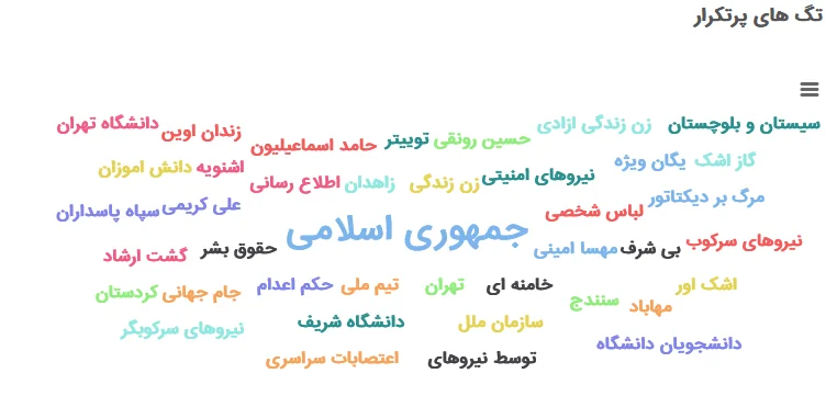 گراف ابرنمای تگهای پرتکرار، پرتکرارترین واژگانی که در کل محتوا از سوی کاربران به کار برده شده را به نمایش در میآورد. در این گراف که از مجموع ۳۷۳ میلیون توئیت گردآوری شده، کلیدواژه «جمهوری اسلامی» پرتکرارترین واژهای است که اشاره به ادبیات سیاسی معترضین و براندازان در ارتباط با ناآرامیهای اخیر ایران دارد.